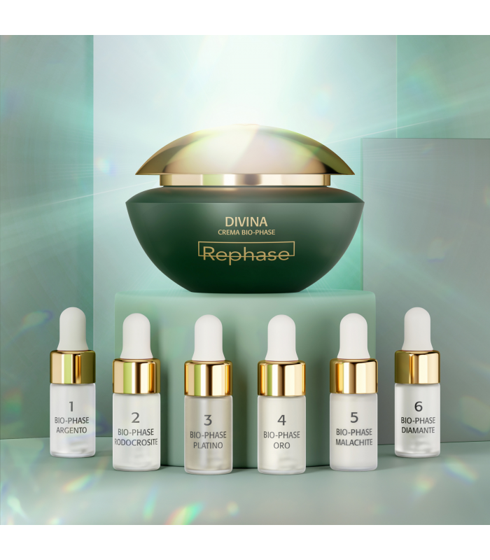 I 6 concentrati sono stati formulati per creare una sinergia unica con la crema DIVINA BIO-PHASE. L’efficacia delle formulazioni di ciascuna ampolla si combina con la texture morbida e fondente della crema per purificare, riequilibrare, rigenerare, levigare, rassodare e illuminare. Ciascuna fase di trattamento è caratterizzata dall’unione di minerali preziosi con peptidi biomimetici, estratti vegetali e attivi biotecnologici per ottimizzare i risultati. La pelle in sei settimane riacquista progressivamente una nuova vitalità.