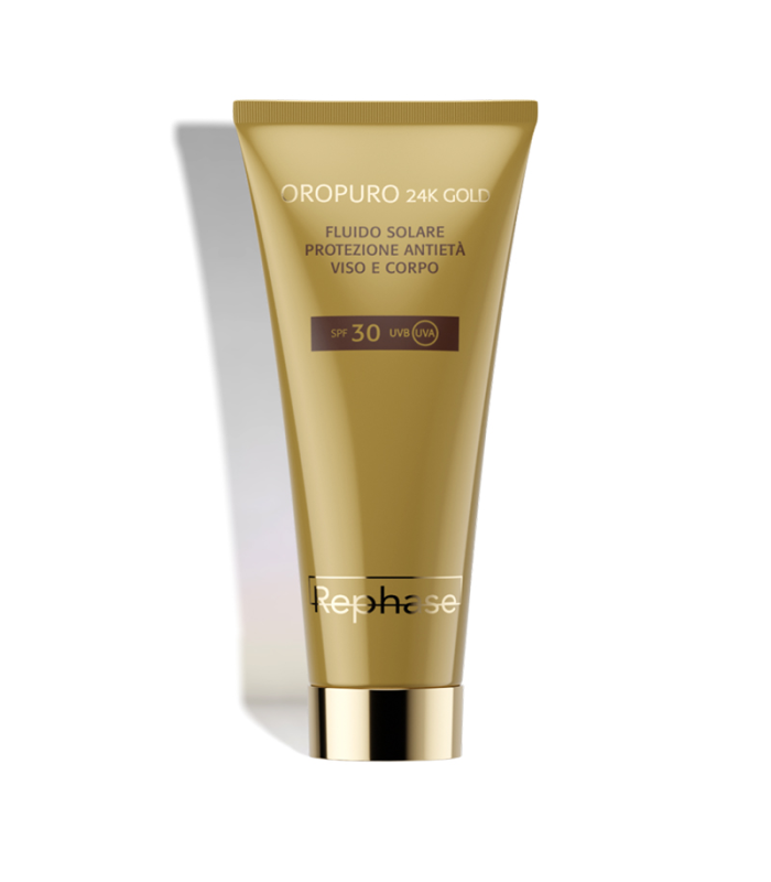 Fluido solare SPF30. Protegge dalle radiazioni solari UVA e UVB, contrastando i danni causati dal fotoinvecchiamento. La sua texture fluida e fondente si assorbe rapidamente lasciando la pelle morbida e idratata. Particelle di oro 24K e oro colloidale regalano luminosità alla pelle per un'abbronzatura dorata e uniforme. Penetra rapidamente, non lascia residui bianchi sulla pelle ed è resistente all'acqua. Fin dalla prima applicazione la pelle è protetta dai danni della fotoesposizione, è idratata, morbida, nutrita, abbronzata e luminosa, pronta per accogliere i benefici del sole.